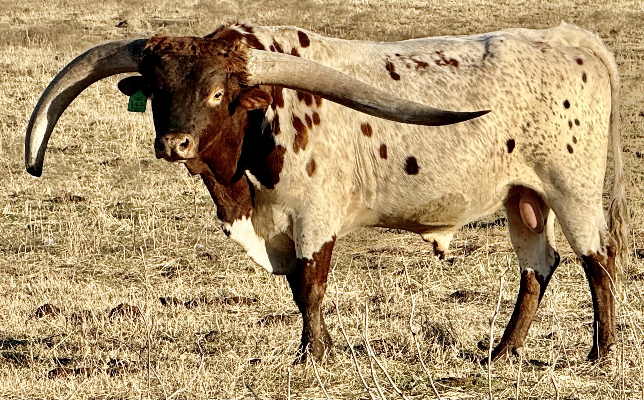 A SUPERSTAR IN THE MAKING DESPITE HIS FROZEN HORN INJURY. HE HAS SIZE, COLOR AND A GENTLE DISPOSITION . HIS PEDIGREE COMBINES MC HANGIN' TUFF (102'' TTT ) WITH TSUNAMIS TUFF PEARL (101'' TTT) . GREAT MATERNAL LINE-- TSUNAMIS TUFF PEARL, MINNIE PEARL AND - FIELD OF PEARLS.HIS UNDAMAGED LEFT HORN WAS APPROXIMATELY 53" FROM TIP TO MIDPOLE AT 4 years WHICH ESTIMATES HIS PROJECTED TTT TO BE 106.0'' .. HE PRODUCED SOME ROBUST CALVES IN 202 AND WE ANTICIPATE GREAT PRODUCTION IN 2026