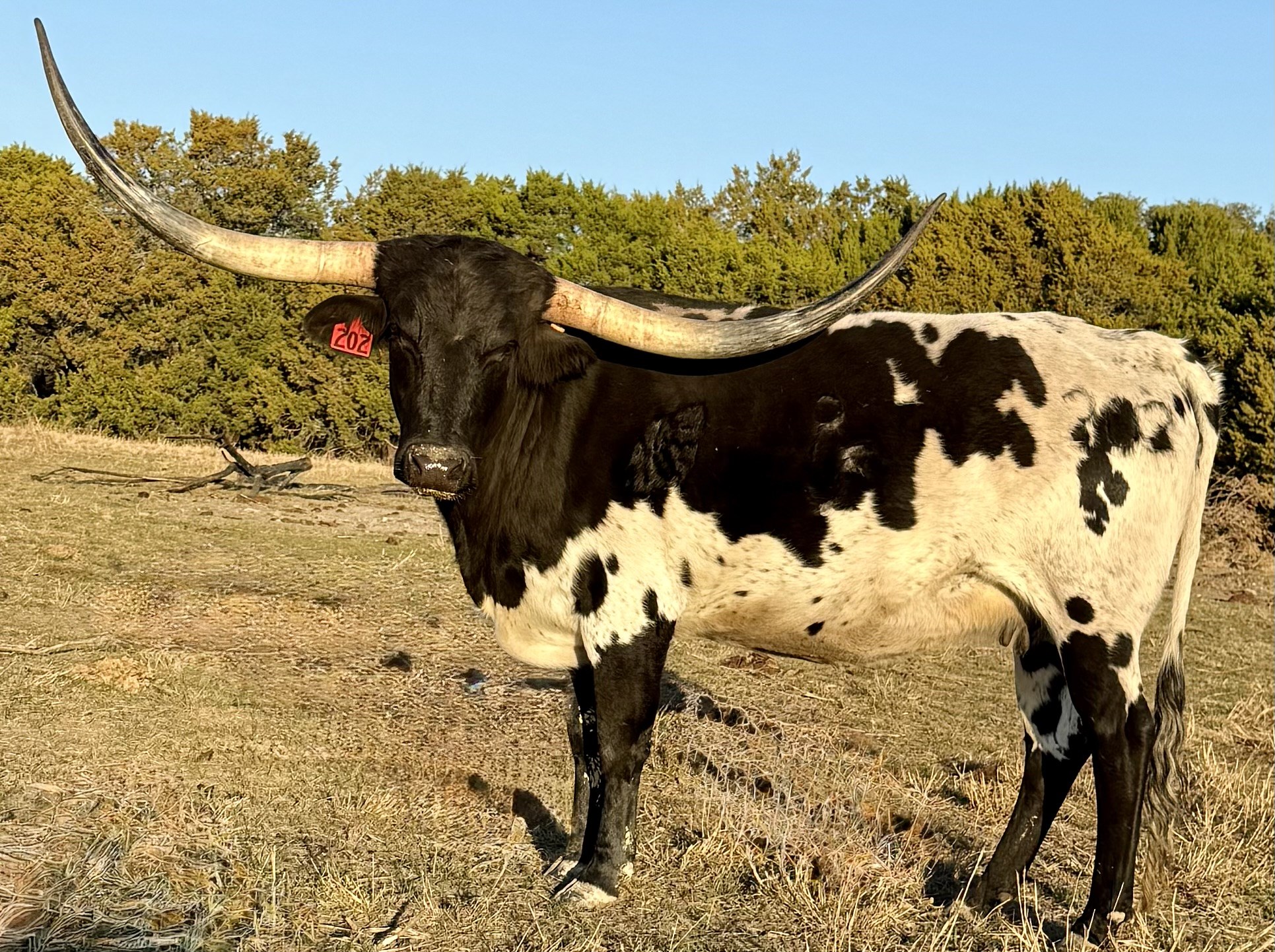 Out of Rural Safari Son, a true black, who is over 90" TTT. Add black and white multi-generation genetics, plus explosive horn from her 100"TTT dam with spot-on conformation and you've got Lovie! Complete package!! End of story!!