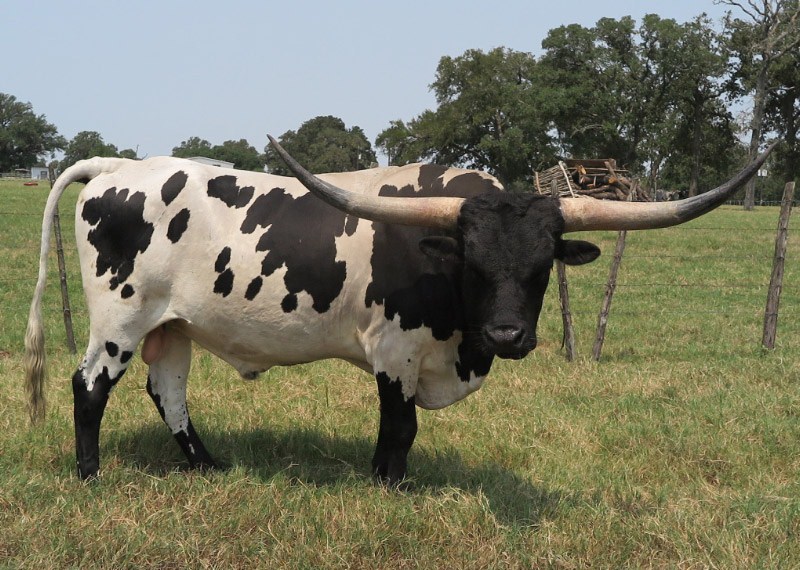 Super young bull. Cowboy Chex son, dam is 80" triple twist. Very big with great black and white colors. He is producing outstanding calves.
